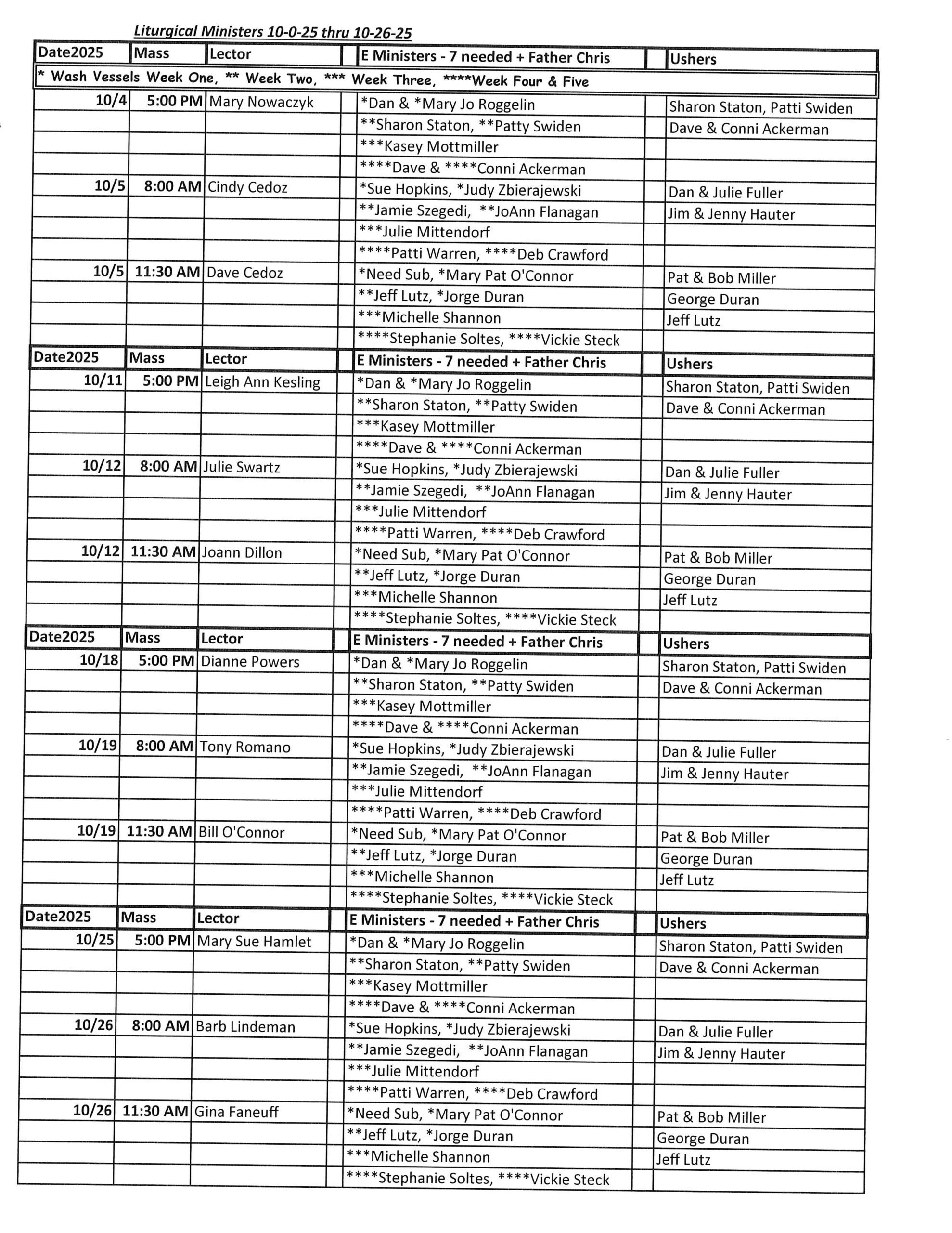 Our Ushers assist with seating as needed and take up the offertory collection. For more information or for scheduling please contact the parish office at (419) 693-1150.